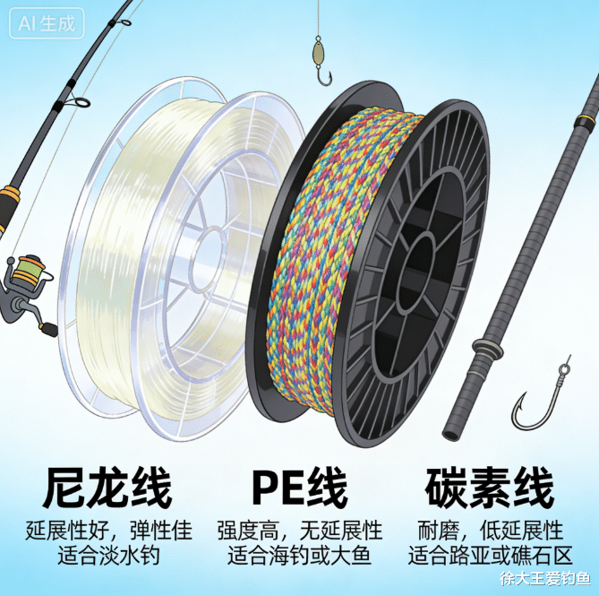 钓鱼时,钓线是连接钓友与鱼的“生命线”,选对钓线能让作钓事半功倍,选错则很可能跑鱼、空竿,甚至毁了整套装备。但市面上的钓线种类繁多,最常见的尼龙线、PE线、碳素线,很多新手看半天也分不清,要么盲目跟风买贵的,要么随便选一款凑合用。其实这三种钓线没有绝对的好坏,关键是匹配自己的作钓场景和目标鱼种。今天就把这三种钓线的区别拆透,从核心特性、优缺点到适用场景,全是实战总结的干货,一文帮你搞懂“不同情况该选哪种线”。